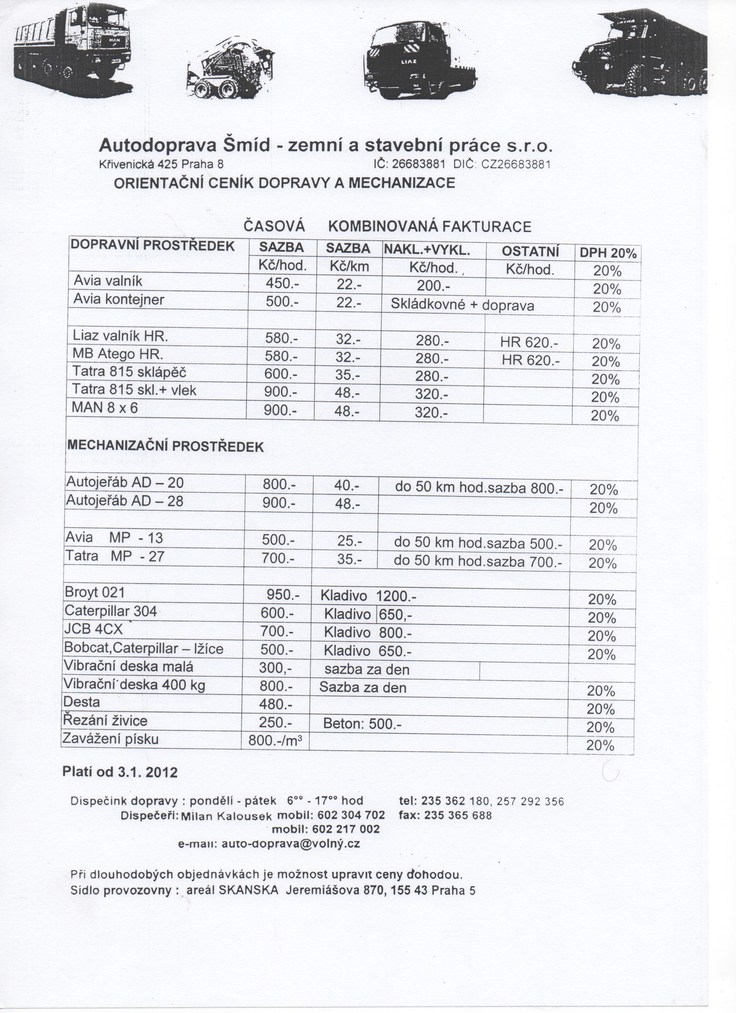 V nákladní autodopravě používáme vozy TATRA, LIAZ, MAN, AVIE - kontejnery. U zemních prací a uložení na skládku využíváme stavební stroje značek JCB, DH 112, BROYT, UDS, BOBCAT, CATER a pásový CATER. Dále využíváme montážní plošiny MP 13, MP 27 a jeřáby 080, 20, 28. Zaměřujeme se na kvalitu odvedené práce, dodržujeme dohodnuté termíny. Snažíme se přizpůsobit našim zákazníkům a vycházet vstříc jejich požadavkům. Jsme spolehliví a při své práci pečliví. Při realizaci zemních a ostatních prací dbáme na bezpečnost práce. Velice si vážíme našich klientů, proto maximální spokojenost zákazníků je pro nás tou největší odměnou. Neváhejte nás kontaktovat a objednat si některé z námi nabízených služeb. Kontakty na naši společnost naleznete na další stránce. REFERENCE FIRMY: * rekonstrukce - Vrtbovské zahrady Magistrát hl. m. Prahy * rekonstrukce - škola Praha 1, Úvoz Avers * rekultivace skládky - Bakov nad Jizerou autoškoda Mladá Boleslav * zemní práce - letiště Ruzyně Bougues CZ * silniční obchvat - Klíčov - Prosek SSŽ Hradec Králové * demoliční práce - kasárna Ruzyně Vojenské stavby * výstavba - výstavba rod. domků ul. Raketová Praha 6, výstavba RD Na Fialce Praha 6 * Inženýrské sítě v SRN pro firmu HOCHTIEF Certifikace: